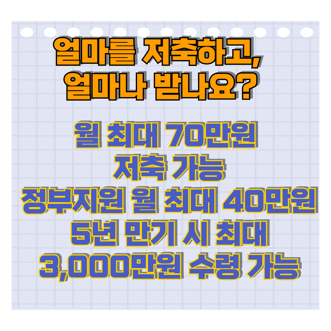 - 월 10만 원씩 저축 (3년간 유지 시 정부 지원금 수령)